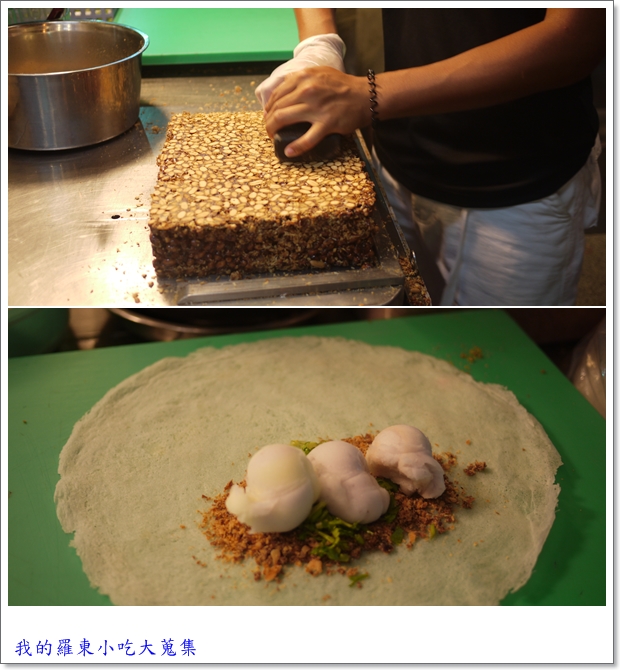 在春捲皮(?!)上,鋪上花生細粉和花生顆粒以及香菜,最後放上古早味冰淇淋,捲一捲就完成了。