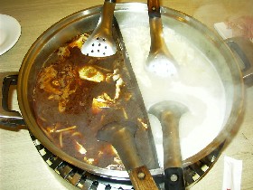 不到一會的時間就送上我們要的食物,偷嚐了一口原汁原味的高湯。嗯~紅鍋不夠辣,就喜歡吃辣的我來說有點食之無味、棄之又可惜的感覺,不過礙於同伴不敢吃太辣,這樣的辣度對他來說是剛剛好;白鍋的湯看起來濁濁,也許是大骨湯吧?!感覺不似平常淡黃色的清高湯,有種詭異的fu。