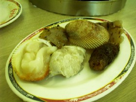 心得:有點小失望,因為店家沒將食物弄得很乾淨,像海參內臟沒清乾淨、鮮蛤沒將沙子吐乾淨....;而珍珠貝因為已解凍,放在盤子上粘粘的很恐怖;雖有小生蠔無限取用,但看起來卻一點賣相也沒有,放在裡層感覺髒髒無新鮮感(抖)。而喜歡吃水果的我看到水果擠擠的擺在上層,望之卻步阿。(OS.喜歡吃多樣水果還是去天外天的好)